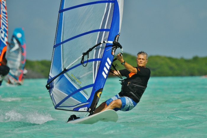 And finally there’s Trevor, also in his 60’s, who has been sailing in Bonaire for years, but with no meniscus in his knee (and unknowingly suffering a serious heart defect) he thought that his days on the water were limited. However, having had both his heart and knee fixed he knew that Bonaire was the perfect place to build up his strength and confidence to enjoy windsurfing once again and is now seen thundering across the Bay trying to beat his speed record.