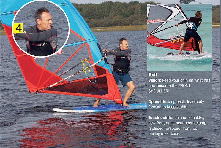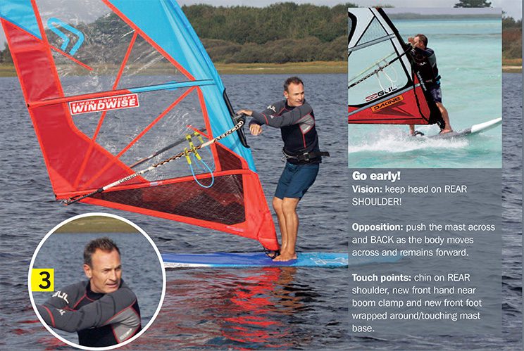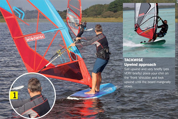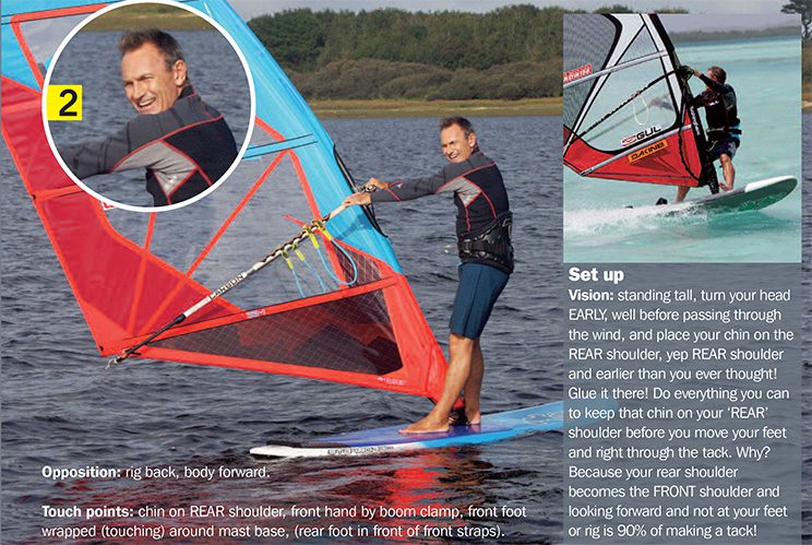 Sail upwind looking forward and putting your chin on your front shoulder (pic 1). Then look back downwind and placing it on your rear shoulder (pic 2). Feel the chin ‘touch’ both shoulders and do it 40-50 times until you feel totally comfortable on any board doing it. We’ve added the Touch Points for hands and feet, but for now focus on CHIN ON SHOULDER and get amazing at it. When tacking you’ll ‘intuitively’ want to look down or at the kit, which is a disaster. Learn to keep your chin on the correct shoulder and you’ll act counter intuitively just when you need to.